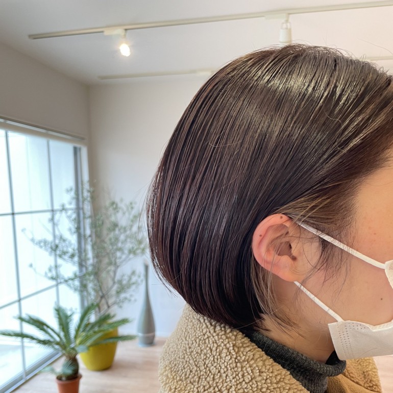 さらっとイヤリングカラーです💐 軽めのショートボブに全体は紫色、耳周りだけブリーチしてベージュをオン✋ (image) 顔色も良く見えて、少しデザインがある ヘアスタイルは楽しいですね👩🏼 春に向け