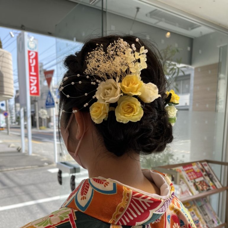 3月、4月は卒業式、入学式があるのでカラーやカット、当日は袴の着付けやヘアセットの予約をいただいていました。 今回は大学の卒業式のヘアセットを担当させてもらいました。 (image) お着物も華や