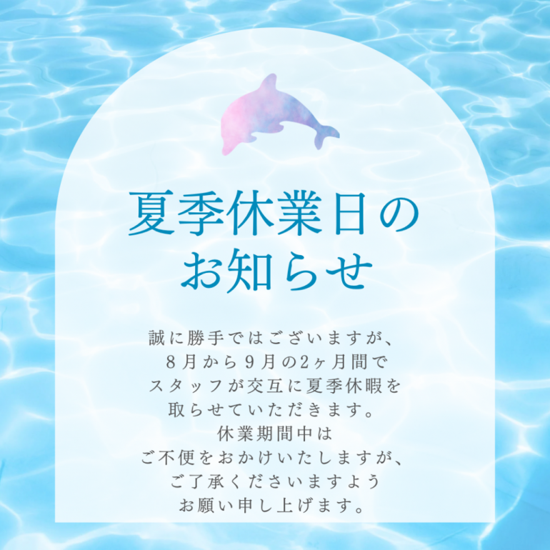 (image) 8月からスタッフ交代交代に 夏休みいただきます。 休業期間中はご不便をおかけしますが、ご了承くださいますようお願いいたします。 shisei 8月5日~8月9日 月~金5日間 河合 8月11日~8月16