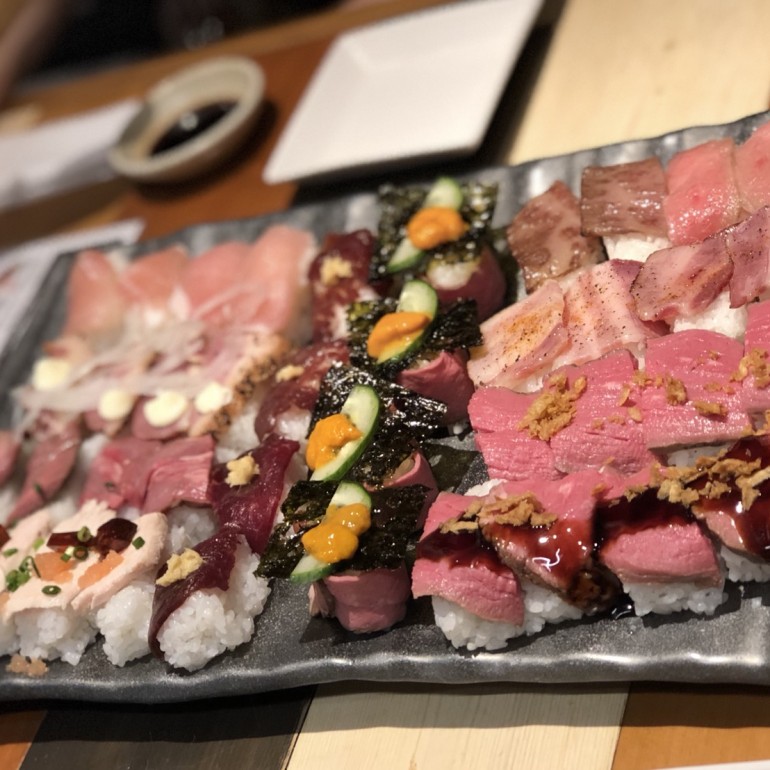 こんにちは!青木です👧🏾 先週のお休みに 名古屋の肉バルにいってきました!! お昼の3時から5組限定の 肉寿司食べ放題。。。 飲み放題500円とゆう驚き価格でした! . . さして問題のお肉