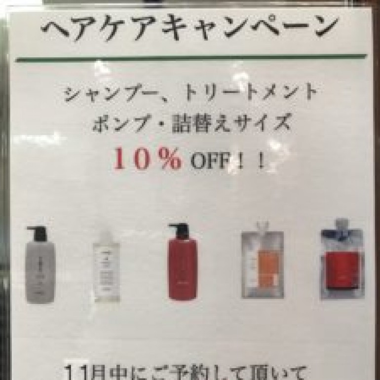 11月に入りシャンプーとトリートメントのキャンペーンが始まりました! ポンプサイズと詰め替えのサイズが御予約いただくと15%オフになります! (image) その場で購入だと10%オフになります!