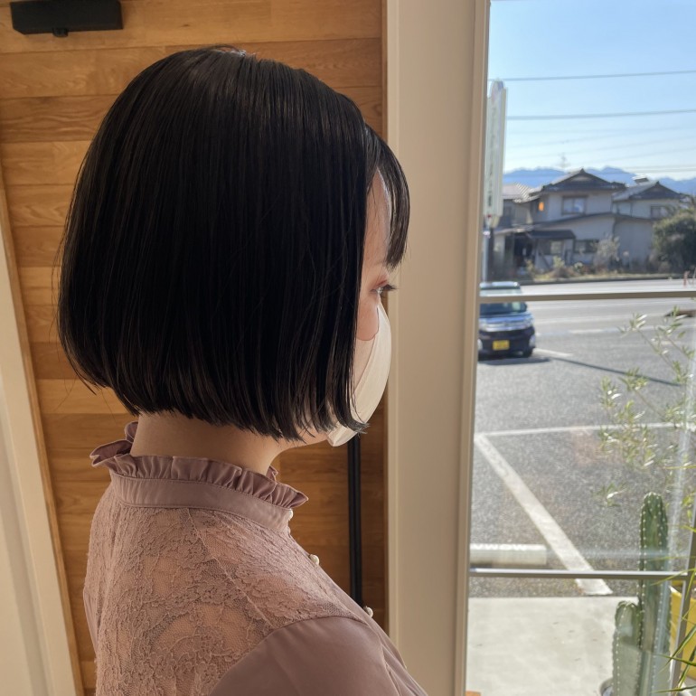 新学期に向けてばっさりと 切らして頂きました🌞 最近は切るなら潔く、ギリギリに! (image) 切りっぱなしのフラットボブ✂︎ コテを使わなくても、 髪質に合わせて、 バーム、オイル👌